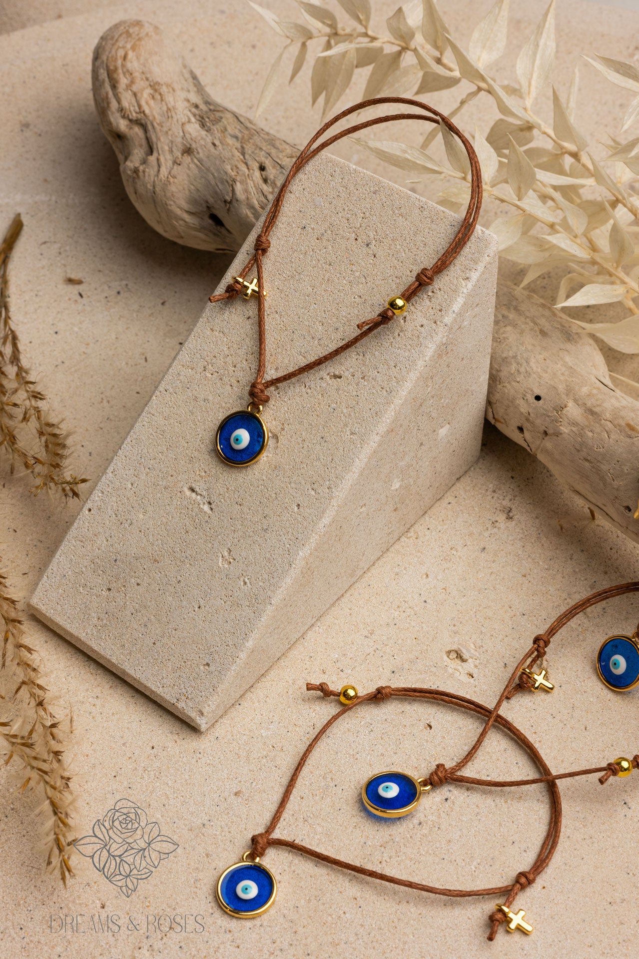 Απογειώστε την ιδέα του μαρτυρικού βραχιολιού για τη βάπτιση του αγοριού σας με αυτό το υπέροχο κομμάτι. Το μαρτυρικό βραχιόλι σε καφέ απόχρωση είναι μια εξαιρετικά κομψή επιλογή, ενώ το επίχρυσο μικρό σταυρουδάκι 24Κ προσδίδει μια λαμπερή νότα πίστης και προστασίας. Η παρουσία του μπλε στρογγυλού βιτρώ με σχέδιο το ματάκι αναδεικνύει την προστασία και την τύχη.