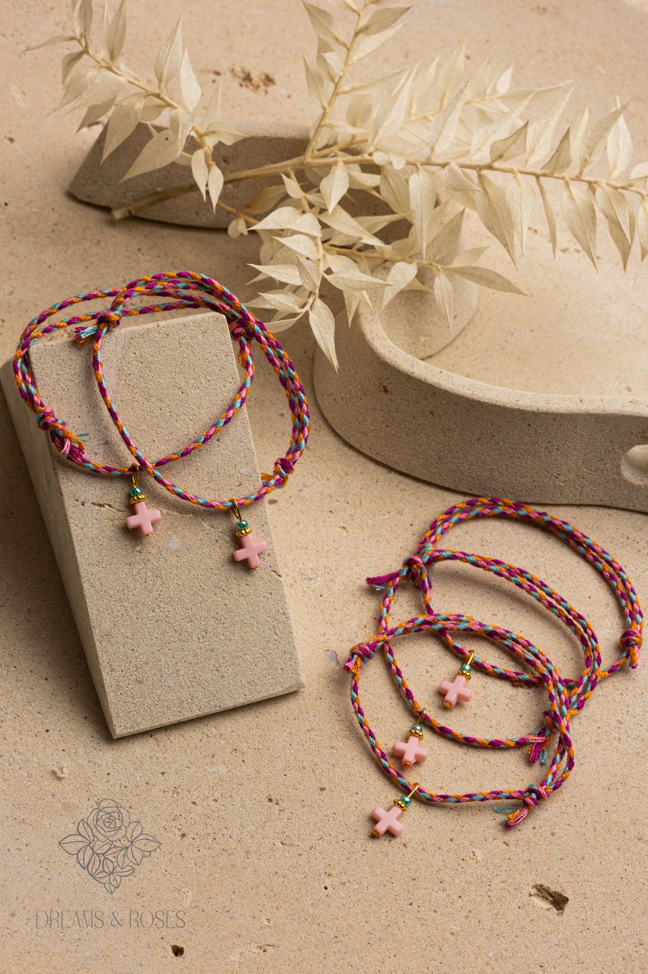 Το μαρτυρικό αυτό είναι ένα εξαιρετικά όμορφο και λεπτομερές δώρο για τους καλεσμένους σας. Αποτελείται από τρίχρωμο βαμβακερό κορδόνι, το οποίο συνδυάζει τα χρώματα πορτοκαλί, μωβ, ροζ και γαλάζιο. Αυτό του προσδίδει έναν εντυπωσιακό και ζωηρό χαρακτήρα. Η προσθήκη του ροζ σταυρού προσδίδει μια θρησκευτική και συνάμα κομψή πινελιά στο σχέδιο, κάνοντάς το κατάλληλο για τη βάπτιση ενός κοριτσιού. Αυτό το μαρτυρικό είναι ένα συμβολικό δώρο που θα θυμίζει στους καλεσμένους σας τη σπουδαία στιγμή της βάπτισης του μωρού σας. Το δίνετε στο τέλος της τελετής προσθέτοντας μια γλυκιά νότα ολοκλήρωσης στην εκδήλωσή σας και αφήνει στους καλεσμένους μια ανεξίτηλη εντύπωση.