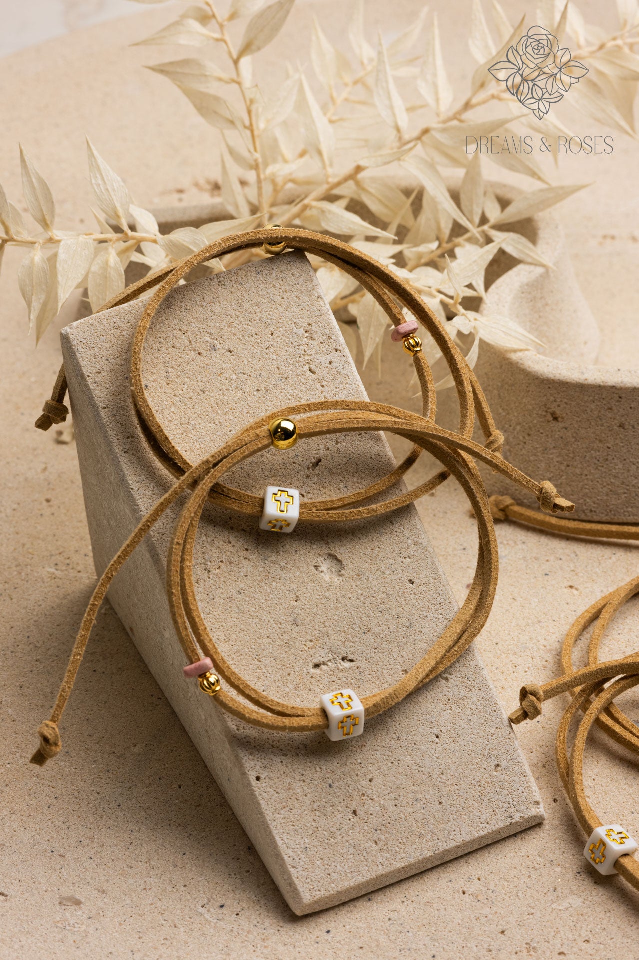 Ένα κομψό και μοντέρνο μαρτυρικό βραχιόλι που θα ενθουσιάσει τους καλεσμένους της βάπτισης. Το διπλό σουέτ βραχιόλι με cube cross σε λευκό χρυσό χρώμα προσφέρει έναν αέρα διακριτικής κομψότητας και λάμψης. Τα cube cross στοιχεία προσδίδουν μια μοντέρνα αισθητική στο βραχιόλι, ενώ η λευκόχρυση απόχρωση του προσθέτει μια αίσθηση κομψότητας. Αποτελεί ένα μνημειώδες ενθύμιο για τους καλεσμένους, που θα τους θυμίζει τη χαρούμενη αυτή ημέρα και την ευλογία που δόθηκε στο μικρό κορίτσι.